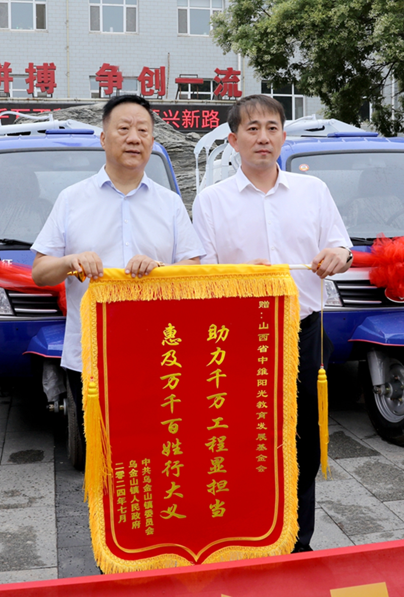 山西中維控股集團(tuán)董事長、中維陽光教育發(fā)展基金會(huì)理事長郭秀忠向聶店村、志村等代表現(xiàn)場捐贈(zèng)。榆次區(qū)烏金山鎮(zhèn)黨委書記袁鵬代表鎮(zhèn)黨委、鎮(zhèn)政府向山西省中維陽光教育發(fā)展基金會(huì)贈(zèng)錦旗,上書“助力千萬工程顯擔(dān)當(dāng)、惠及萬千百姓行大義”。